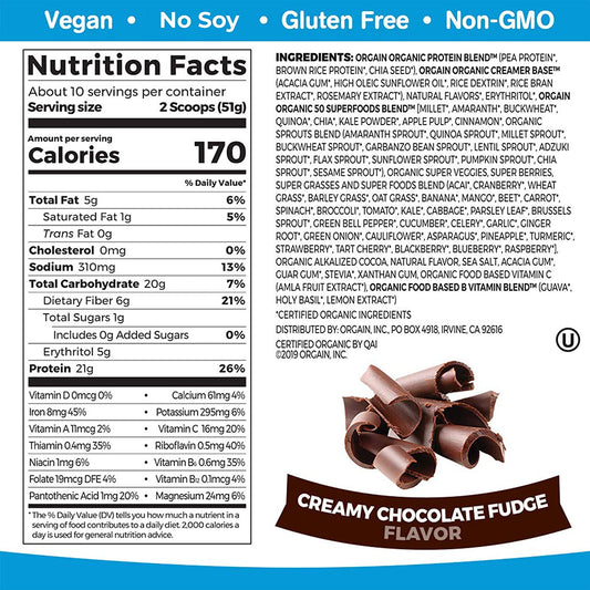 Orgain Organic Plant Based Protein Powder, Creamy Chocolate Fudge